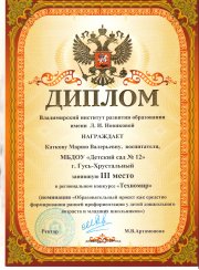 Воспитатель Каткова Мария Валерьевна награждена дипломом Владимирского института развития образования им. Л.И. Новиковой за 3 место в региональном конкурсе "Техномир" в номинации "Образовательный проект, как средство формирования ранней профориентации у д